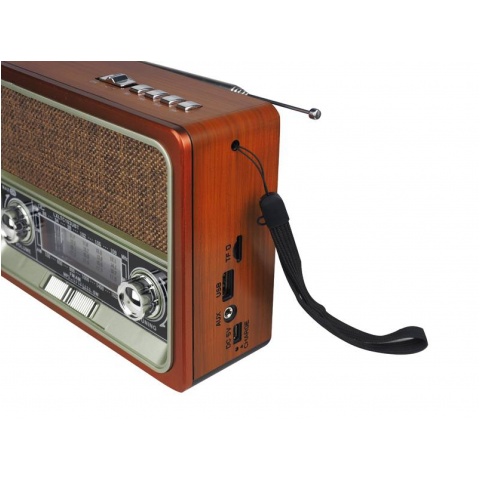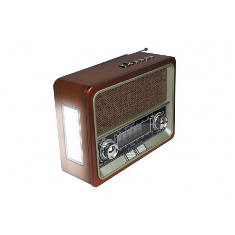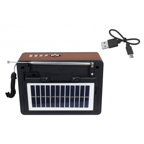 Kompaktowy radioodbiornik z teleskopową anteną, łącznością Bluetooth i panelem solarnym, nawiązujący stylistyką do urządzeń retro.