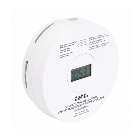 Czujnik CTD-1 służy do ciągłego monitorowania niebezpiecznego stężenia tlenku węgla oraz dymu w powietrzu. Ostrzegając zarówno przed zatruciem czadem jaki i zagrożeniem pożarowym. W momencie wykrycia zagrożenia czujnik uruchamia głośny sygnał dźwiękowy (min. 85 dB) oraz optyczny w postaci migającej diody. Wyposażony jest w precyzyjne i niezawodne czujniki elektrochemiczny i fotoelektryczny o żywotności 10 lat. Znakomitą jego zaletą jest także to, że ma on wbudowaną wydajną baterię litową wystarczającą na cały okres życia czujnika.