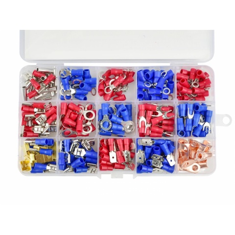 Zestaw konektorów izolowanych przeznaczonych do zakańczania kabli. Konektory zaciskowe szczególnie przydatne są do wykonywania zakończeń kablowych na przewodach wielodrutowych. Korzystanie z konektorów kablowych gwarantuje solidne utrzymanie w jednym miejscu wszystkich luźnych drucików znajdujących się w przewodach. Znacznie zmniejsza to możliwość wystąpienie zwarcia. Konektory izolowane wykonane z miedzi cynowanej oraz izolacji z PVC.