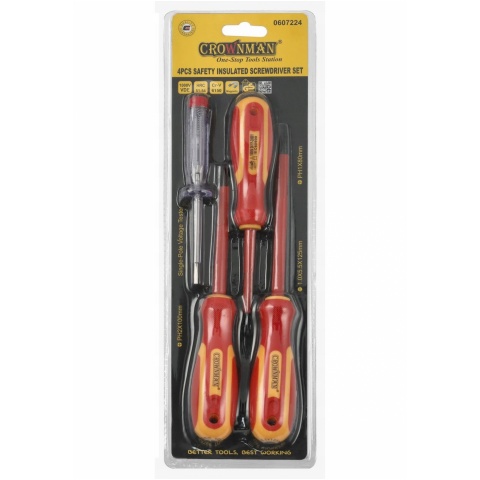Crownman – zestaw 4 izolowanych wkrętaków 1000V z magnetycznymi końcówkami oraz próbnikiem napięcia. Profesjonalne narzędzia, które łączą bezpieczeństwo, trwałość i komfort pracy.